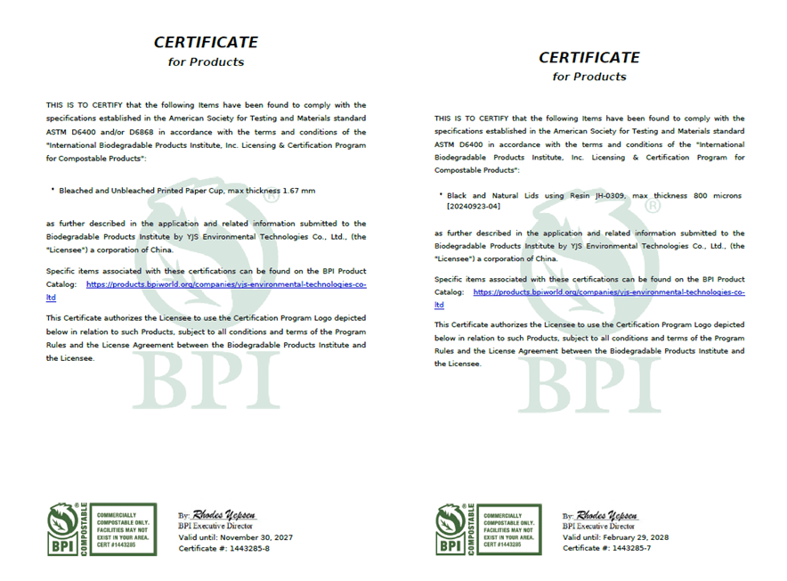 在財團法人塑膠工業技術發展中心(PIDC)的專業輔導下,裕佳昇全系列產品正式通過美國 BPI(Biodegradable Products Institute,可生物分解產品協會)認證,符合ASTM D6400/D6868標準,並可安全應用於商業堆肥處理系統。此一里程碑不僅彰顯裕佳昇在研發、製程與驗證上的專業能量,更奠定其作為具備出口實力之可信賴供應商的地位,為全球餐飲、零售與製造產業提供國際合規的綠色解決方案,持續打造循環經濟新典範。